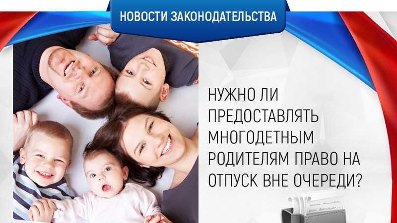 Работники, у которых три и более ребенка до 12 лет смогут самостоятельно выбирать, когда использовать ежегодный оплачиваемый отпуск. Соответствующее право установят в новой 262.2 статье ТК. Законопроект во втором чтении депутаты приняли 18 сентября. Согласно пояснительной записке нововведение: — даст многодетным родителям возможность более активно участвовать в воспитании детей; — позволит совместить время отдыха обоих работающих родителей, что увеличит для них возможность полноценного отдыха.