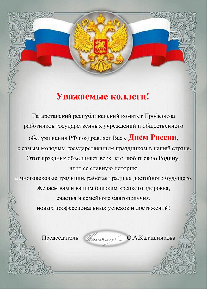 ПОЗДРАВЛЕНИЕ КАЛАШНИКОВОЙ О.А. ПРЕДСЕДАТЕЛЯ ТАТАРСТАНСКОЙ РЕСПУБЛИКАНСКОЙ ОРГАНИЗАЦИИ ПРОФСОЮЗА
